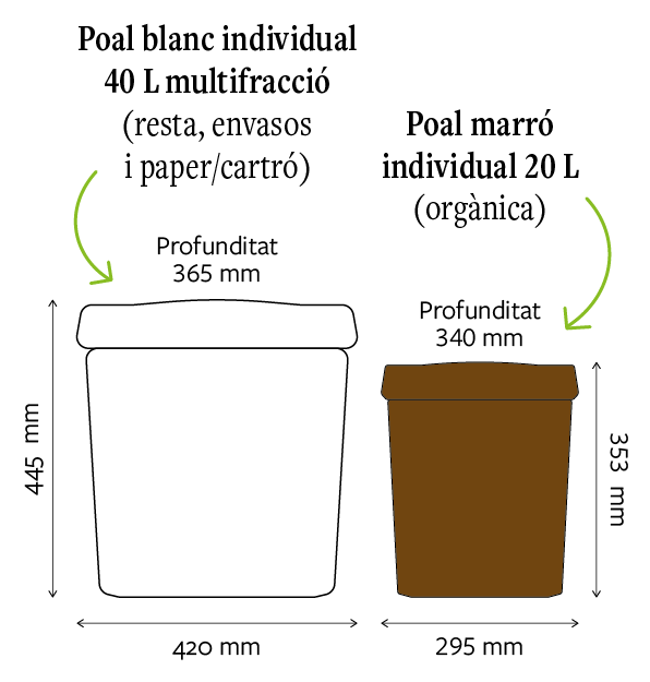Cada habitatge disposa de dos cubells: el poal marró per a la fracció orgànica i el poal blanc multifracció per a envasos, paper i cartró i resta.